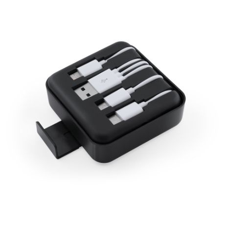 Versatile 3-in-1 charger cable housed in a practical case with an integrated smartphone holder. Includes Micro USB connection, Type C and Lightning connectors for universal compatibility.