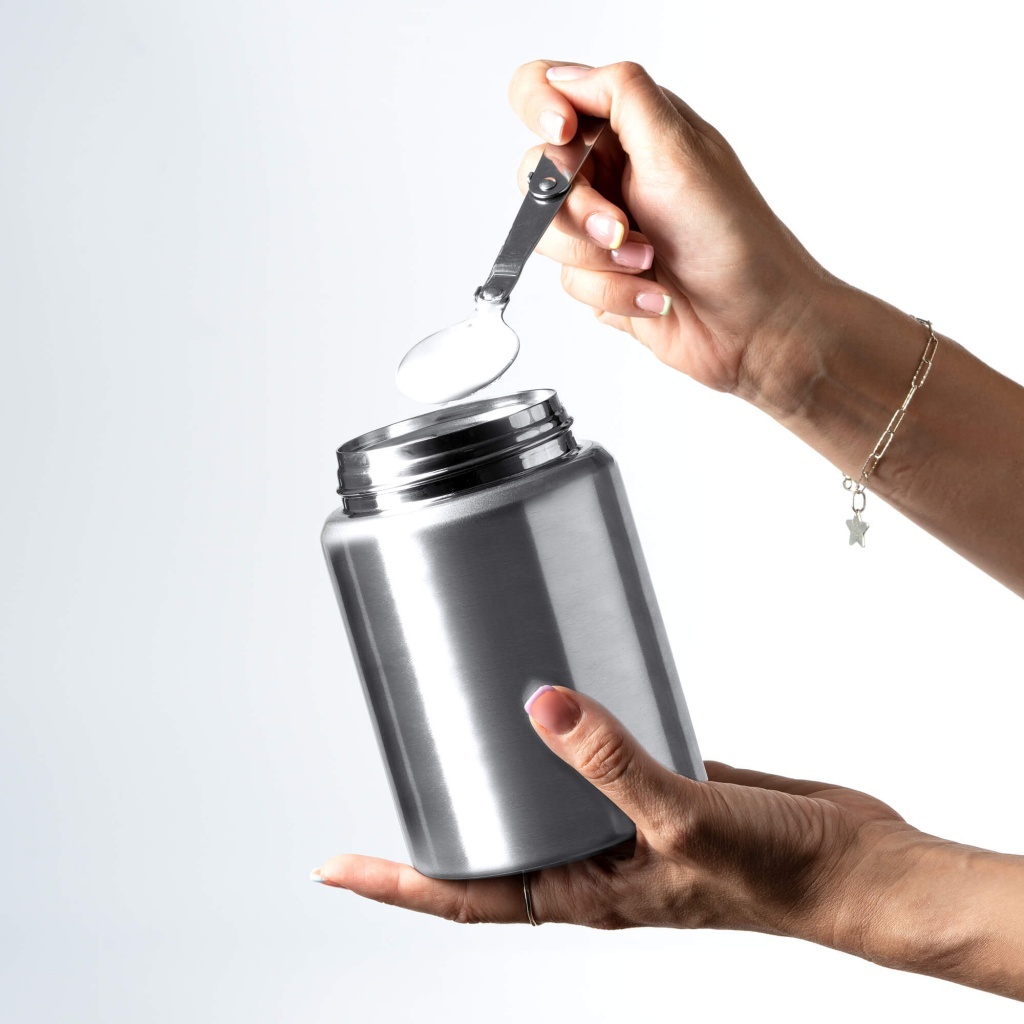 Double wall thermos crafted from high-quality stainless steel, perfect for keeping soups, stews and other meals hot or cold while on the go.