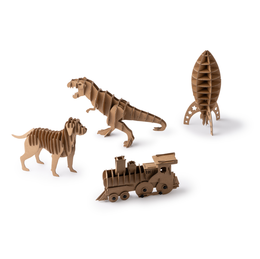 3D cardboard jigsaw puzzles available in four designs—dog, T-Rex dinosaur, train and rocket—perfect for play and educational use. These puzzles encourage creativity and develop manual skills for both children and adults, making them a fun learning activity or a hands-on gift option.