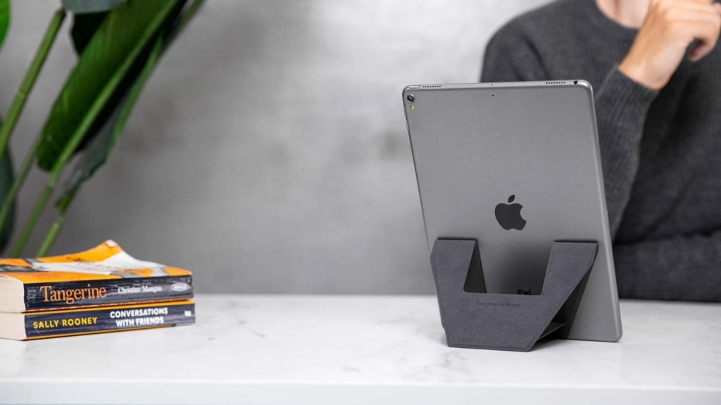 Stop straining your hands while holding your tablet. Ultra-thin and foldable, it functions as a stand for both portrait and landscape viewing. Attaches and detaches easily without scratching or leaving adhesive residue. Reusable and can double as a handle. Suitable for tablets from 9.7 to 13 inches; for smaller tablets, consider the FoldStand Tablet Mini.