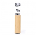 Stylish 500 ml. double-walled stainless steel bottle featuring a screw cap and a removable inner filter. The exterior is finished in natural bamboo for a warm, eco-friendly look, and it is presented in a kraft cardboard design box.