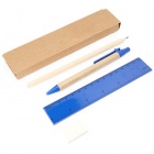Five-piece stationery set in a kraft cardboard case, featuring a ball pen with a cardboard body and blue ink, a wooden pencil, a sharpener, an eraser and a 15 cm. ruler — ideal for promotional gifts, school kits and on-the-go writing needs.