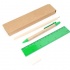 Five-piece stationery set in a kraft cardboard case, featuring a ball pen with a cardboard body and blue ink, a wooden pencil, a sharpener, an eraser and a 15 cm. ruler — ideal for promotional gifts, school kits and on-the-go writing needs.