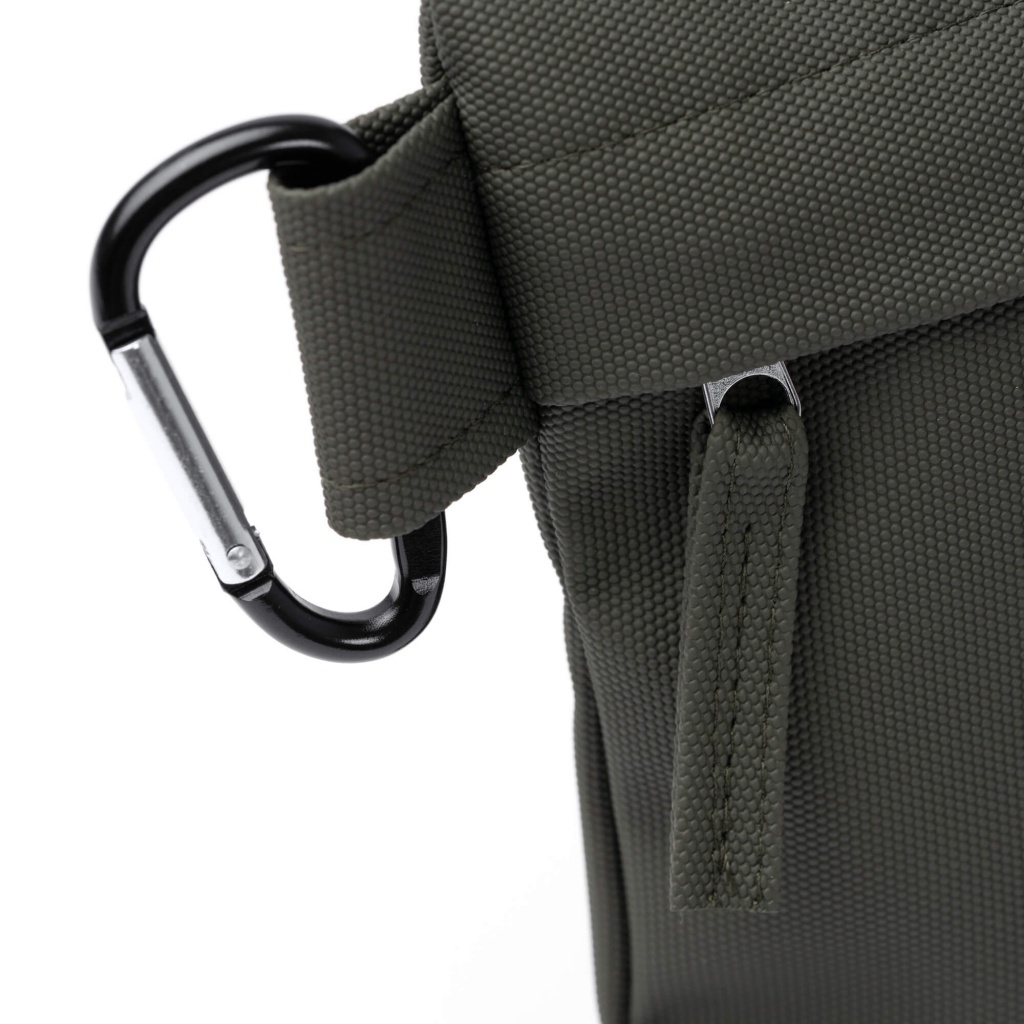 Cosmetic bag crafted from soft polyurethane with a solid-color finish. Zipper closure and included carabiner for convenient carrying.