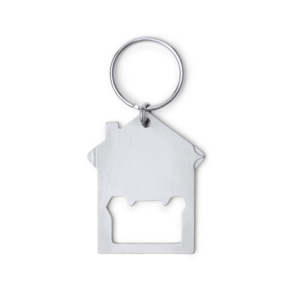 House-shaped stainless steel keychain featuring multiple tools: a bottle opener, flat and Phillips screwdrivers on the sides, and M3 and M4 Allen keys located beside the main opening.