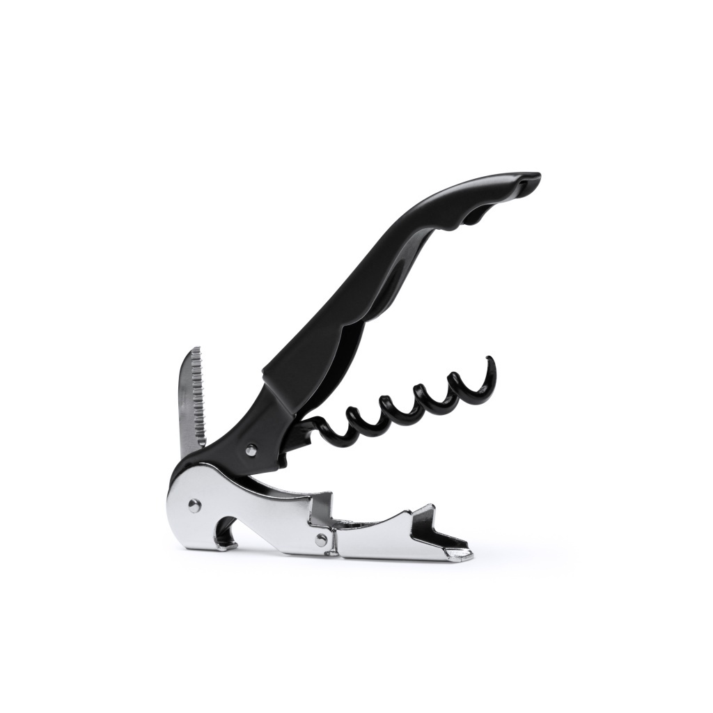 This classic stainless steel corkscrew offers excellent durability while remaining lightweight. It is highly functional and easy to handle, taking up very little space. The handle includes a film cutter and a capped-bottle opener, enabling you to remove corks quickly and efficiently.