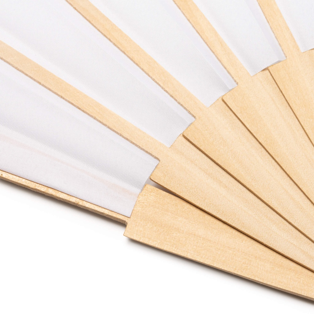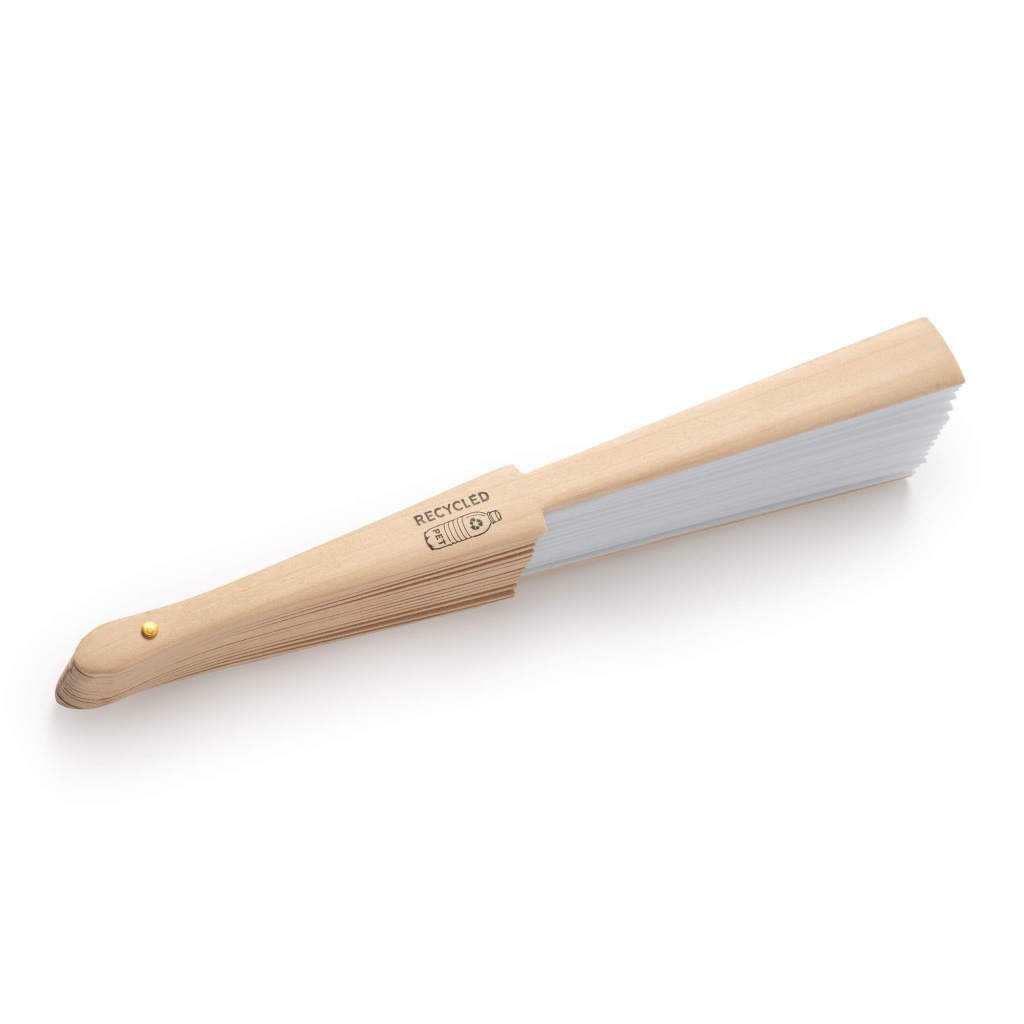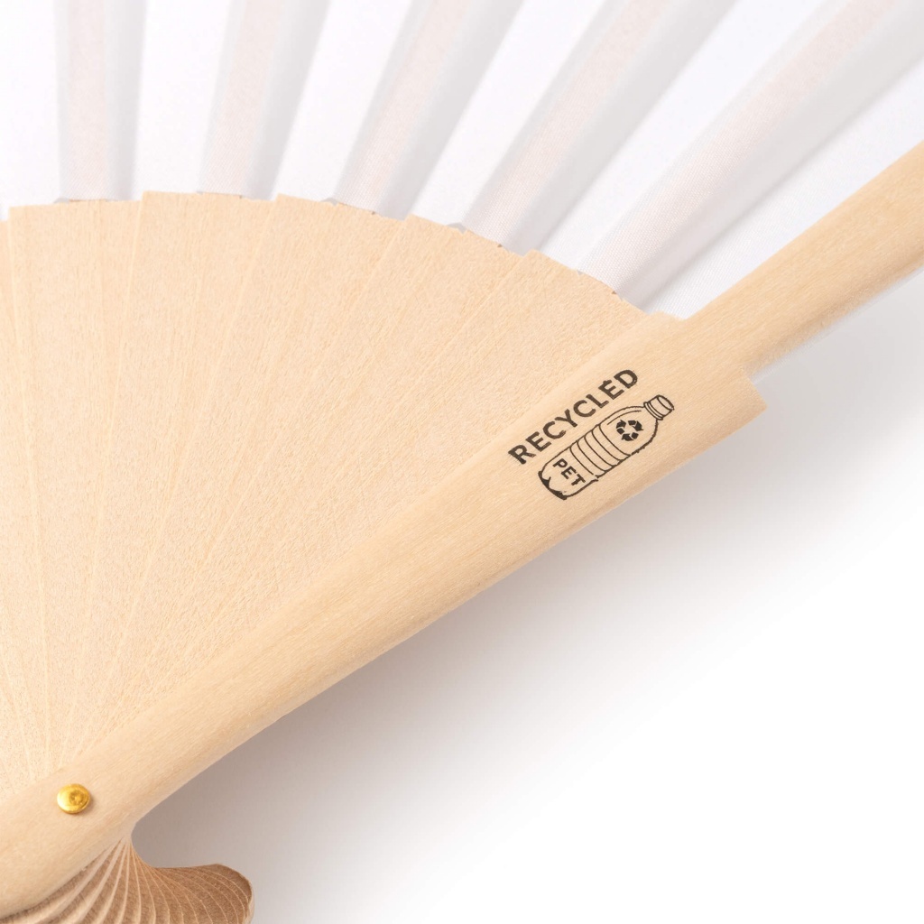 Fan featuring wooden blades and RPET fabric.
