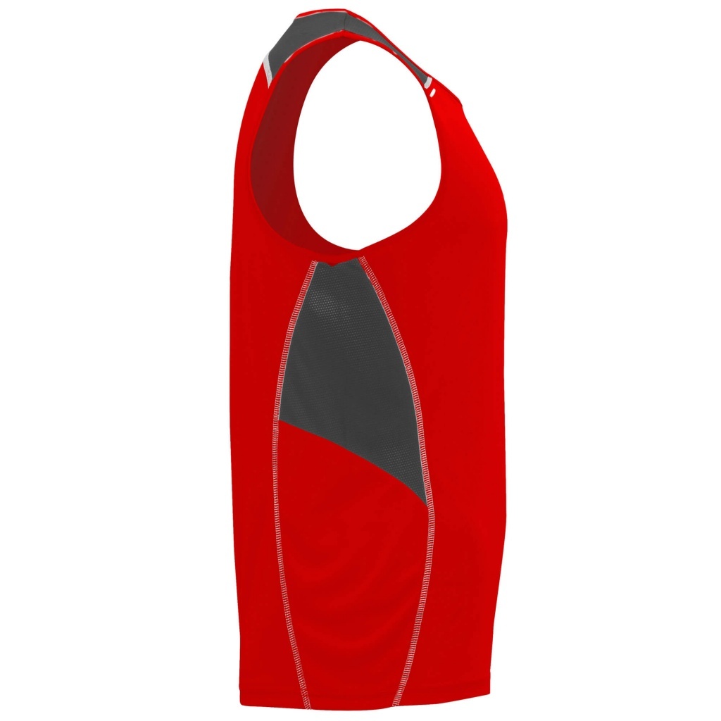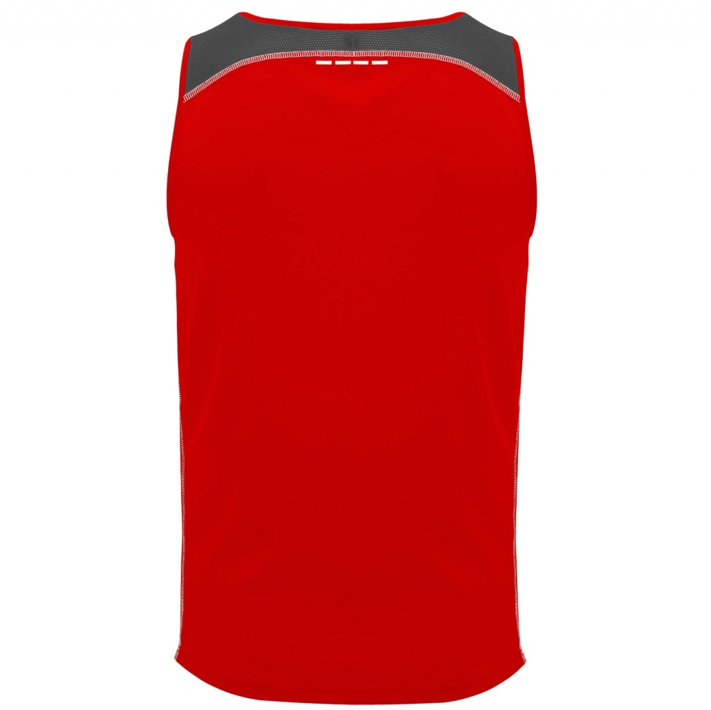 Lightweight technical tank top featuring reflective accents. Round neck with reinforced covered seams. Constructed from two polyester fabrics in three colours. Main body in interlock fabric, side and upper panels in microperforated fabric to enhance breathability. Fast-drying.