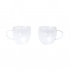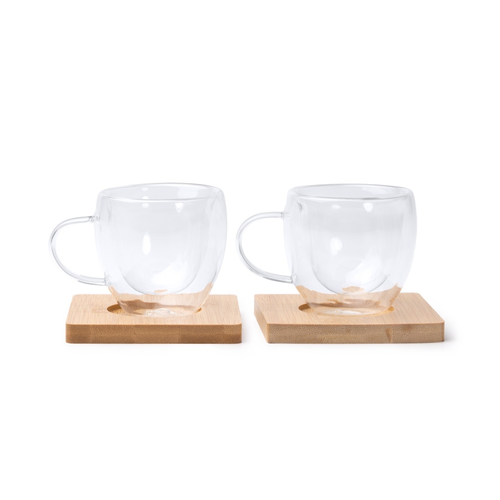 Elegant coffee set featuring two double-walled glass mugs, each paired with a square bamboo coaster. The double-wall construction provides effective heat insulation for comfortable handling. Capacity of each mug: 90 ml.