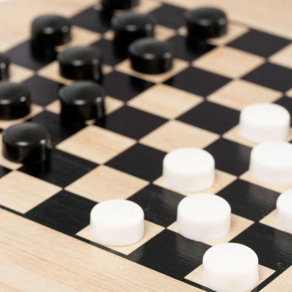 Portable beach game set crafted from wood and wheat fiber, featuring game boards for chess, checkers and parcheesi; includes pawns for immediate play.
