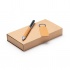 Pen and key ring crafted from recycled leather with metallic details. Blue ink. Packaged in a case designed with the environment in mind.