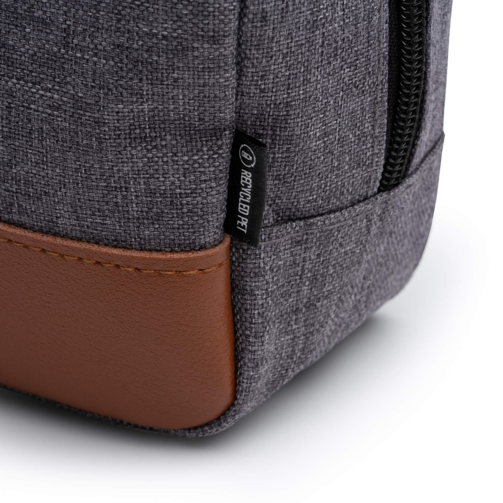 Sleek cosmetic bag crafted from recycled RPET polyester with PU leather elements and a carrying handle — carry your essentials comfortably and in style.