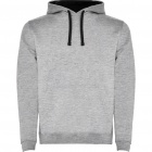 Two-tone double fabric hoodie with drawstring hem. Kangaroo style pocket. Elastic cuffs and waistband.