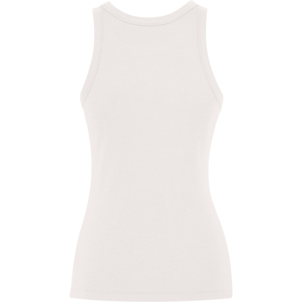 Women's ribbed tank top. Collar and shoulder feature cutouts with wide trim in the same fabric, reinforced with double stitching. Double stitching at the hem.