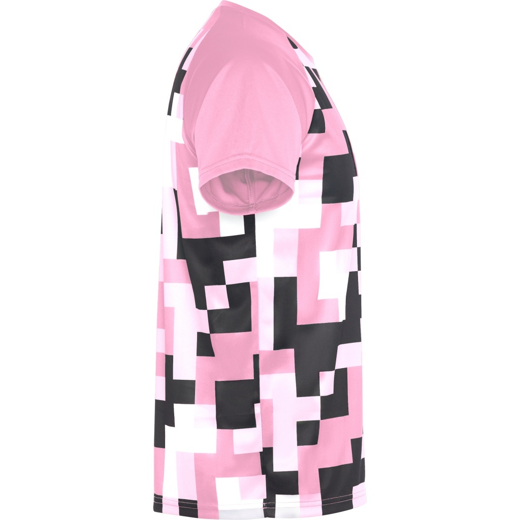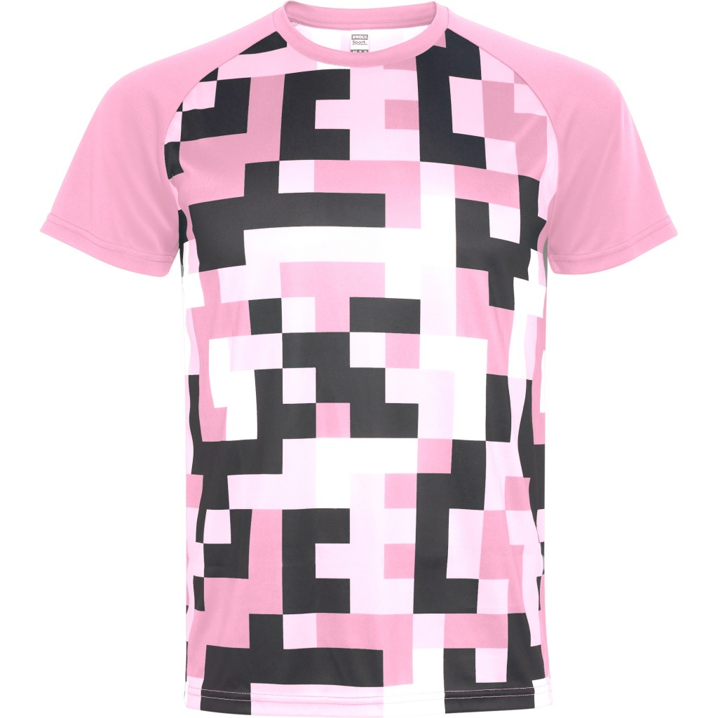 Unisex technical T-shirt featuring short raglan sleeves in a contrasting solid color. The front and back are fully sublimated for vibrant, all-over print, with a neckline made from the same fabric and color as the sleeves for a cohesive finish.