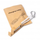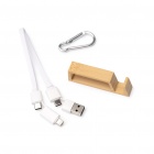 Kabel 4 w 1 z adapterami: USB typu C, Lightning oraz złączami USB i USB typu C. Wyposażony w bambusowe akcesorium pełniące funkcję uchwytu na smartfon oraz etui ochronne na końcówki kabla. W zestawie karabińczyk do wygodnego przenoszenia.