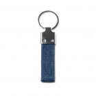 Prostokątny brelok wykonany z tkaniny dżinsowej.