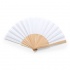 Stylowy wachlarz z drewnianą konstrukcją i tkaniną poliestrową.