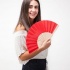 Stylowy wachlarz z drewnianą konstrukcją i tkaniną poliestrową.