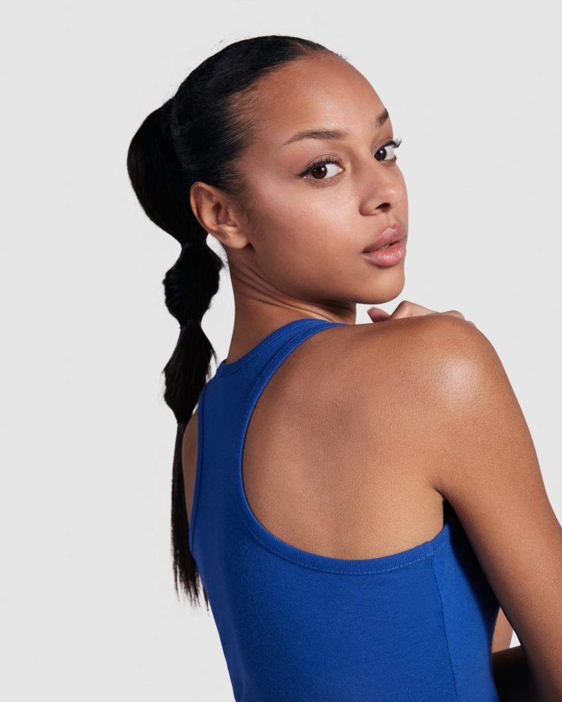 Dopasowany damski top. Dekolt i ramiona wykończone lamówką. Tył w stylu pływackim. Szwy boczne.