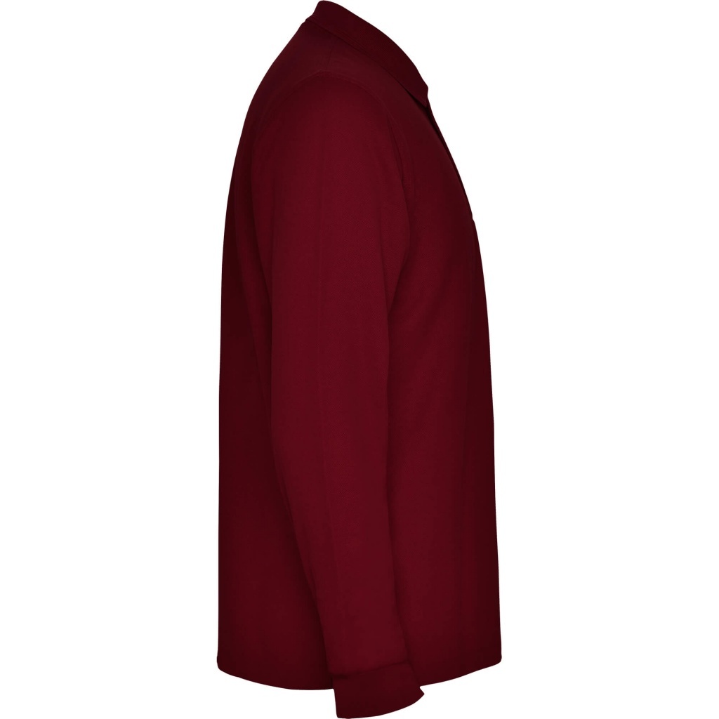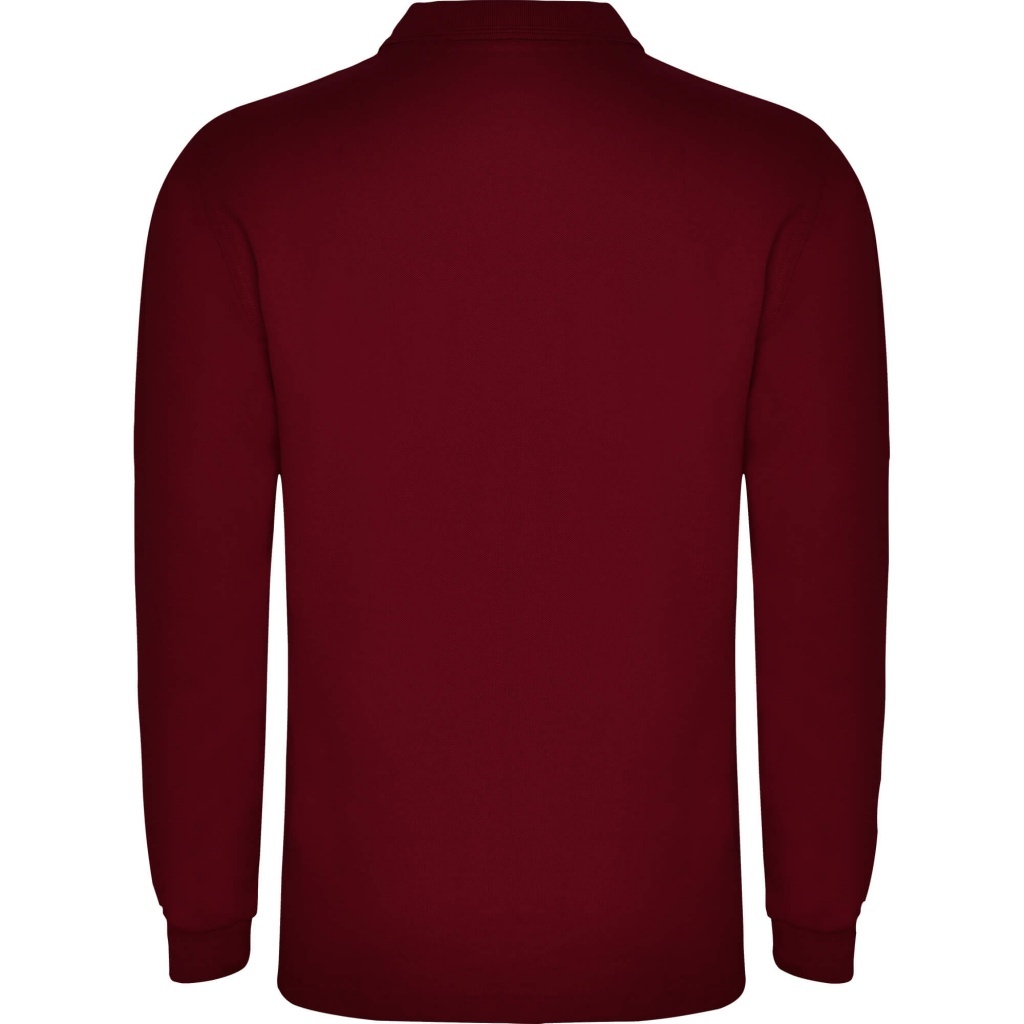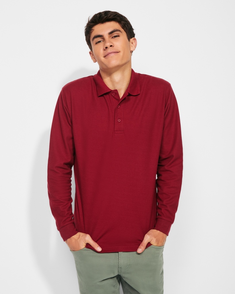 Koszulka polo z długim rękawem. Zapięcie na trzy guziki (dwa guziki w modelu dziecięcym). Prążkowany kołnierzyk i mankiety. Wzmocnione, kryte szwy przy kołnierzyku. Boczne rozcięcia. Elastyczne ściągacze przy mankietach.