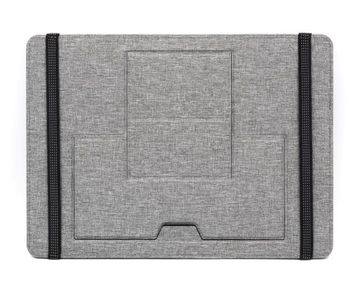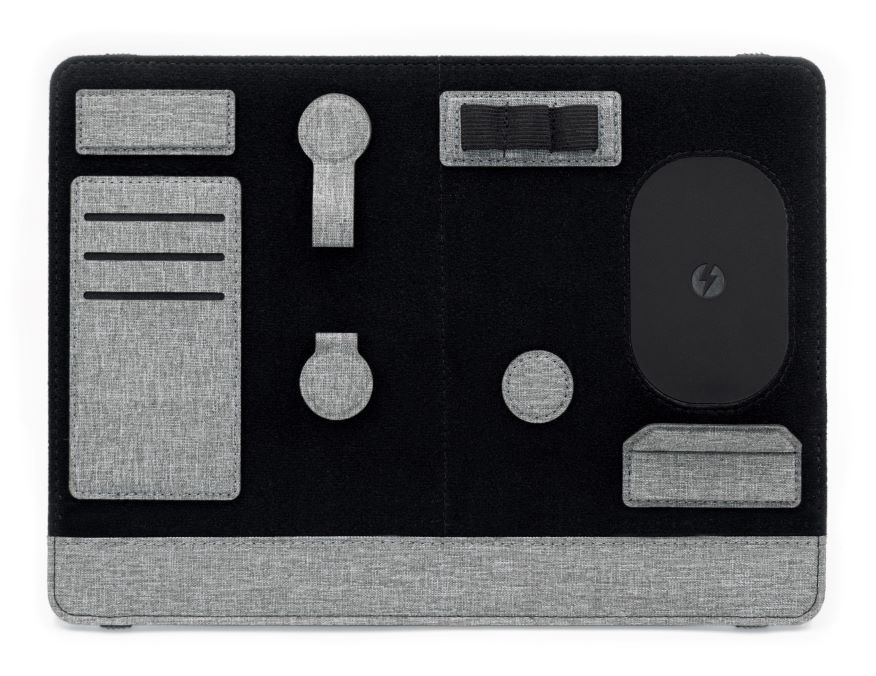 Wykonany z przetworzonych ♻ butelek PET, Clipboard Pro Eco pełni jednocześnie funkcję organizera mocowanego do laptopa oraz stojaka/organizatora na biurko — idealny dla współczesnych nomadów. Organizer zawiera regulowany stojak na telefon z szybkim ładowaniem bezprzewodowym 15 W, schowek, dwie magnetyczne stacje dokujące, uchwyt na długopis, uchwyt na karty, klips do kabla oraz podstawkę na telefon. Organizacja przestrzeni na biurku jeszcze nigdy nie była tak prosta! Produkt mocuje się do laptopa podobnie jak elastyczna zakładka. Clipboard Pro posiada także zintegrowaną, składana podstawkę pod laptopa, tworząc ergonomiczną przestrzeń pracy w dowolnym miejscu.