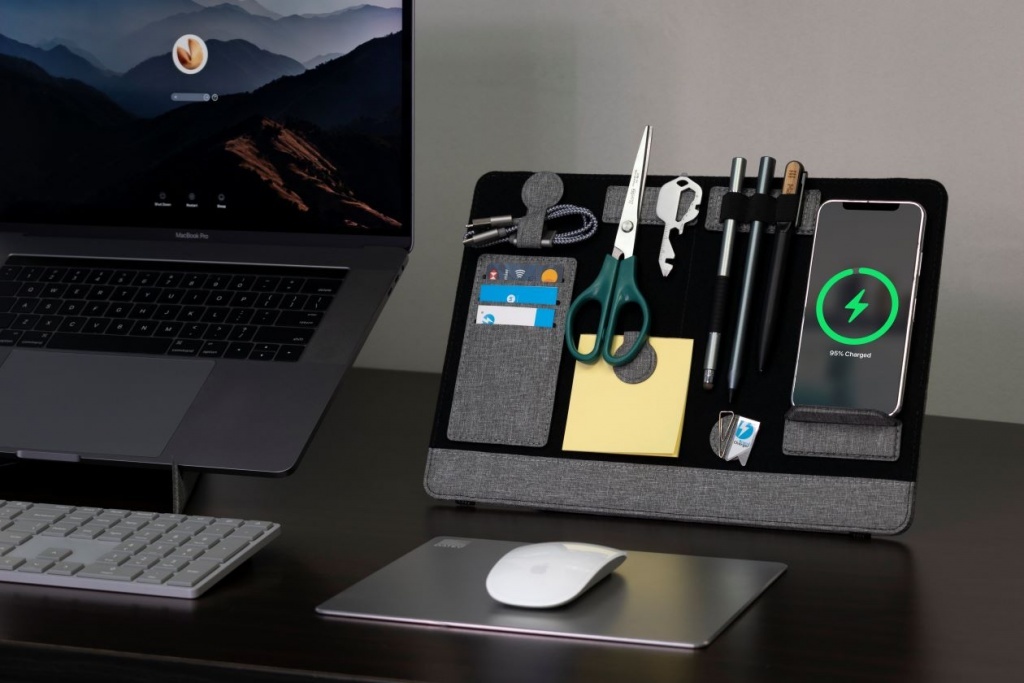 - Zintegrowana podstawka pod laptopa: zapewnia wygodny kąt widzenia oraz optymalny przepływ powietrza dla chłodzenia laptopa. Organizer na biurko oferuje schowek, dwie magnetyczne stacje dokujące, uchwyt na długopis, uchwyt na karty, klips do kabla i podstawkę na telefon.
