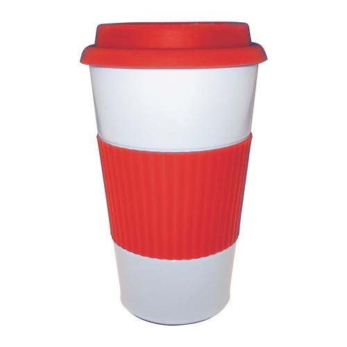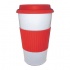 Stalowy kubek termiczny z silikonową opaską zapewnia pewny chwyt oraz wygodę użytkowania.