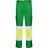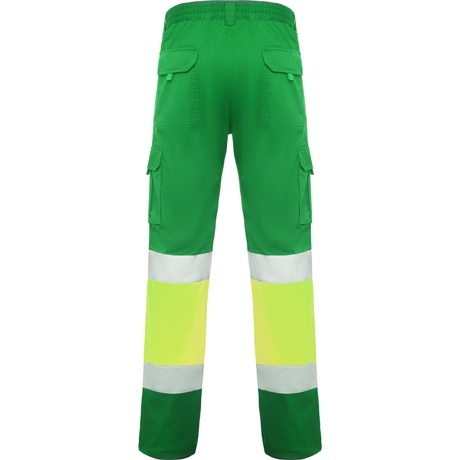 Długie spodnie robocze z licznymi kieszeniami, dobrze widoczne z daleka.