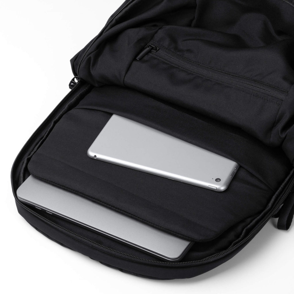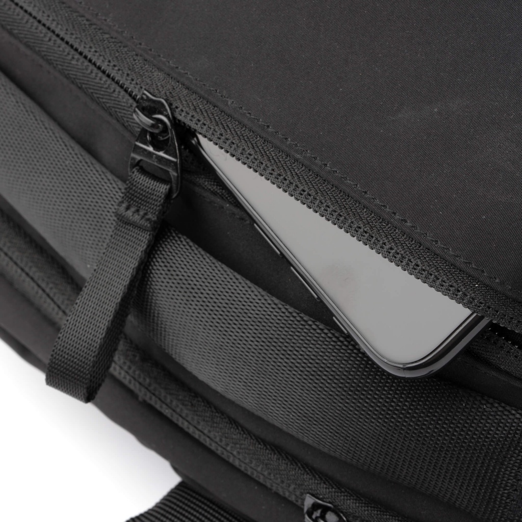 Plecak zrobiony z poliestru 150D. W głównej komorze znajduje się podwójna kieszeń z wyściełaną przegrodą mieszczącą laptop do 17 cali oraz dodatkowa mniejsza kieszeń zapinana na zamek. Z przodu znajduje się zewnętrzna kieszeń z ukrytym zamkiem do drobnych rzeczy. Po bokach umieszczono dwie głębokie, niewidoczne kieszenie — jedna z nich zamykana na zamek. W komplecie pasek do wózka. Plecak wyposażono w wyściełane szelki i oparcie dla zwiększenia komfortu. Dzięki zastosowanej tkaninie jest wyjątkowo trwały i uniwersalny pod względem rozmieszczenia kieszeni.