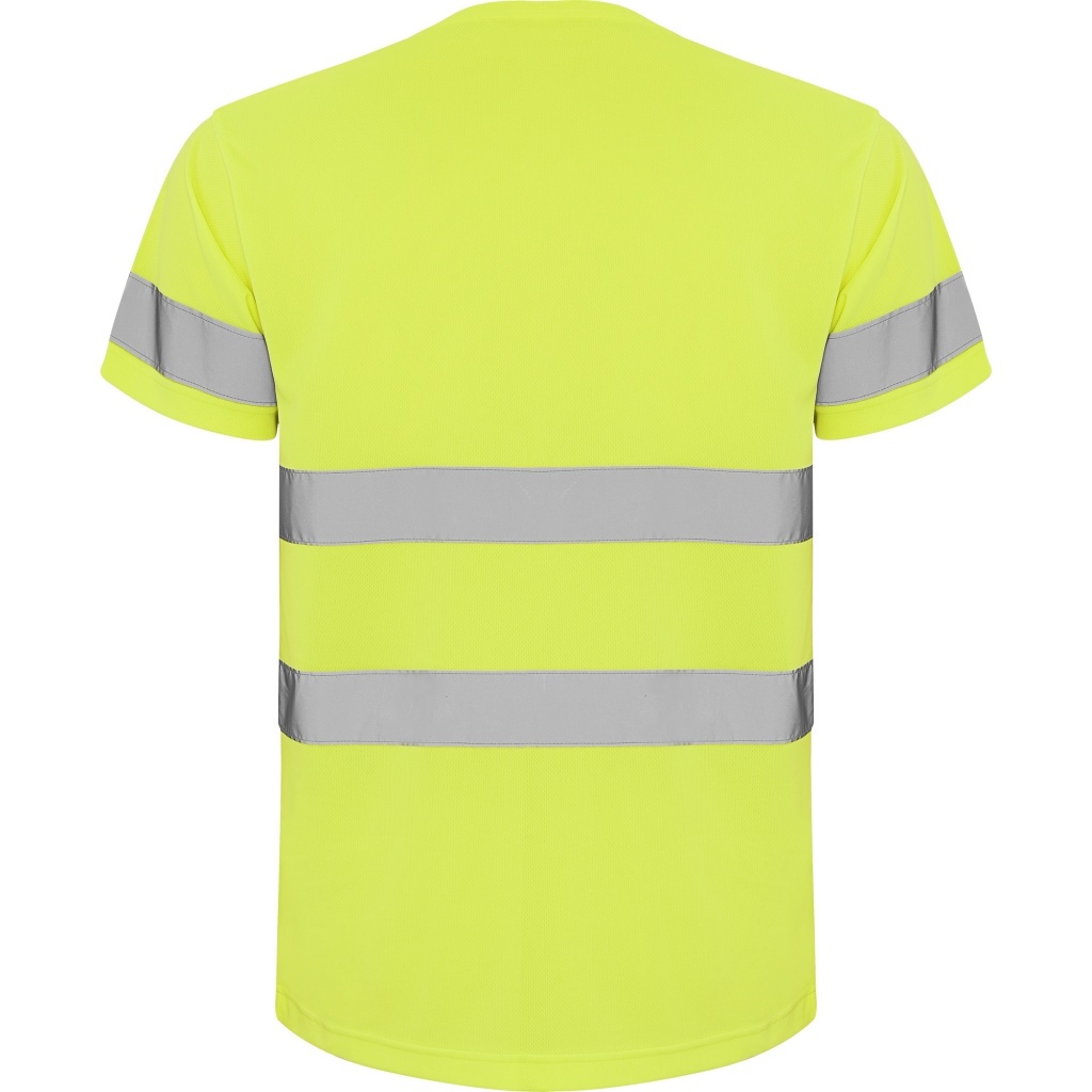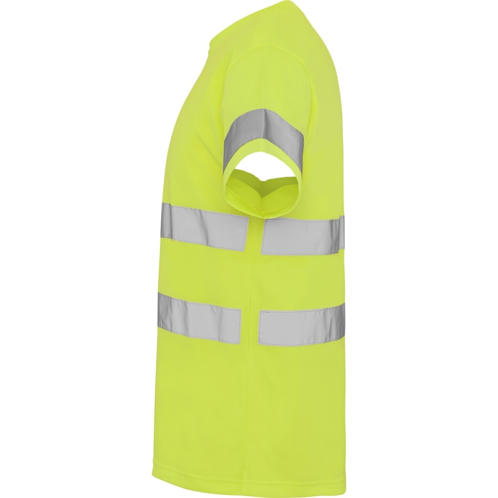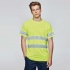 Techniczna koszulka z krótkim rękawem zapewniająca wysoką widoczność. Okrągły dekolt wykonany z tej samej tkaniny z wzmocnionymi szwami. Dwie poziome taśmy odblaskowe na środku oraz pojedyncze taśmy na rękawkach.