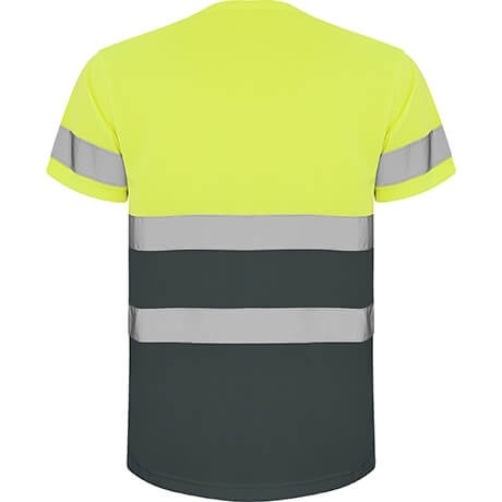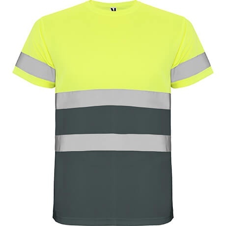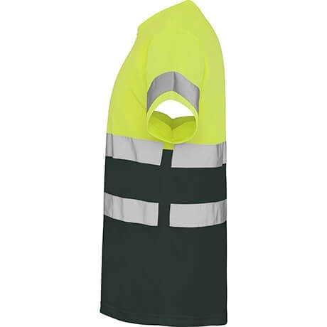 Techniczna koszulka z krótkim rękawem zapewniająca wysoką widoczność. Okrągły dekolt wykonany z tej samej tkaniny z wzmocnionymi szwami. Dwie poziome taśmy odblaskowe na środku oraz pojedyncze taśmy na rękawkach.