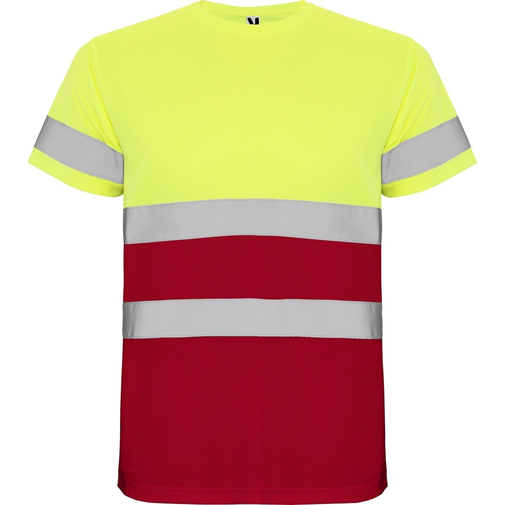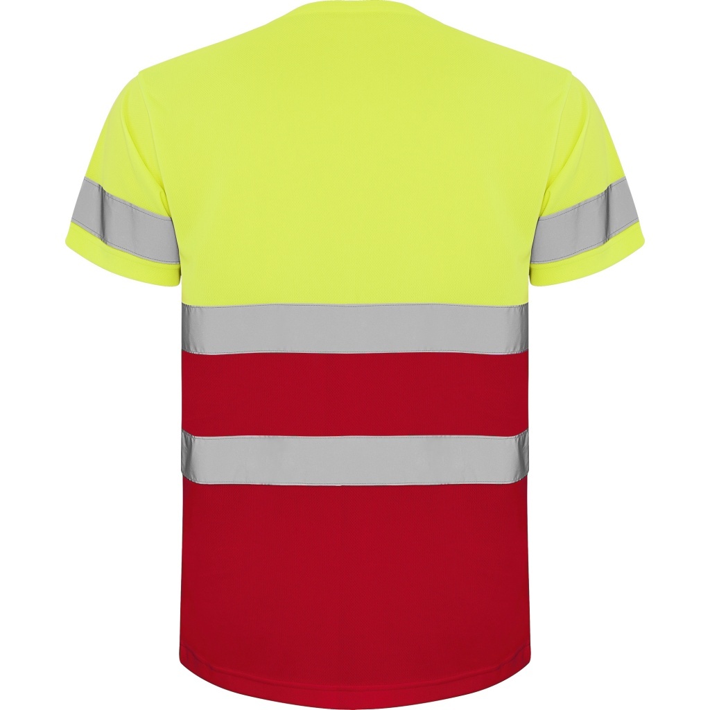Techniczna koszulka z krótkim rękawem zapewniająca wysoką widoczność. Okrągły dekolt wykonany z tej samej tkaniny z wzmocnionymi szwami. Dwie poziome taśmy odblaskowe na środku oraz pojedyncze taśmy na rękawkach.