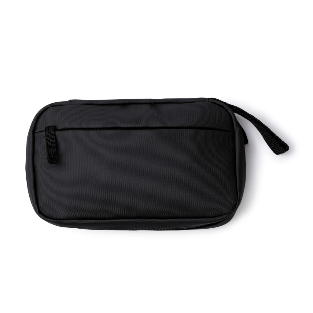 Kosmetyczka z poliuretanu zapinana na zamek błyskawiczny. Wnętrze zawiera dwie przegrody z siatki — jedną zamykaną na zamek oraz drugą podzieloną na mniejsze kieszonki. Z przodu znajduje się dodatkowa kieszeń na zameb błyskawiczny. Zamki i uchwyt do przenoszenia dopasowane kolorystycznie do kosmetyczki.