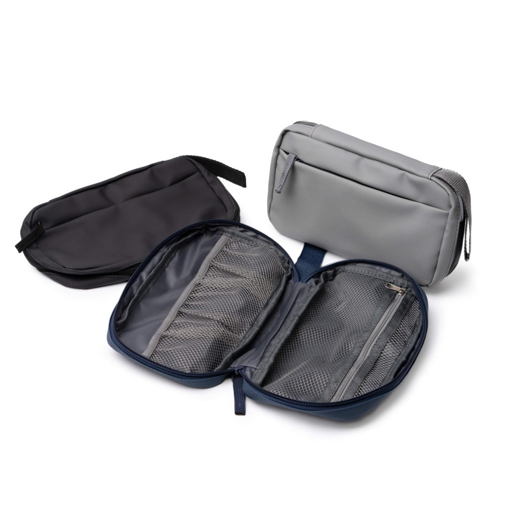 Kosmetyczka z poliuretanu zapinana na zamek błyskawiczny. Wnętrze zawiera dwie przegrody z siatki — jedną zamykaną na zamek oraz drugą podzieloną na mniejsze kieszonki. Z przodu znajduje się dodatkowa kieszeń na zameb błyskawiczny. Zamki i uchwyt do przenoszenia dopasowane kolorystycznie do kosmetyczki.