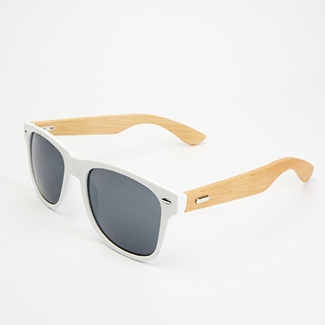 Stylowe okulary przeciwsłoneczne z błyszczącymi oprawkami i zausznikami wykonanymi z naturalnego bambusa. Soczewki z filtrem UV400 zapewniają ochronę przed szkodliwym promieniowaniem.