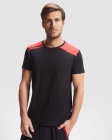 Kolorowa koszulka z krótkim rękawem, z okrągłym dekoltem wykończonym kontrastową wewnętrzną obwódką. Kontrastowe wstawki na ramionach oraz dopracowane detale.