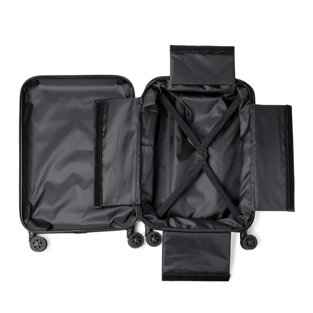 Składany wózek kabinowy, który ułatwia przechowywanie, wyposażono w 4 obrotowe koła 360 stopni. Wykonany z elastycznego poliestru RPET z recyklingu, to propozycja dla podróżników ceniących praktyczność i zrównoważony rozwój. Przeznaczony na międzynarodowe podróże, łączy kompaktową konstrukcję z ekologicznymi materiałami, zapewniając komfort i wszechstronność podczas każdej podróży.