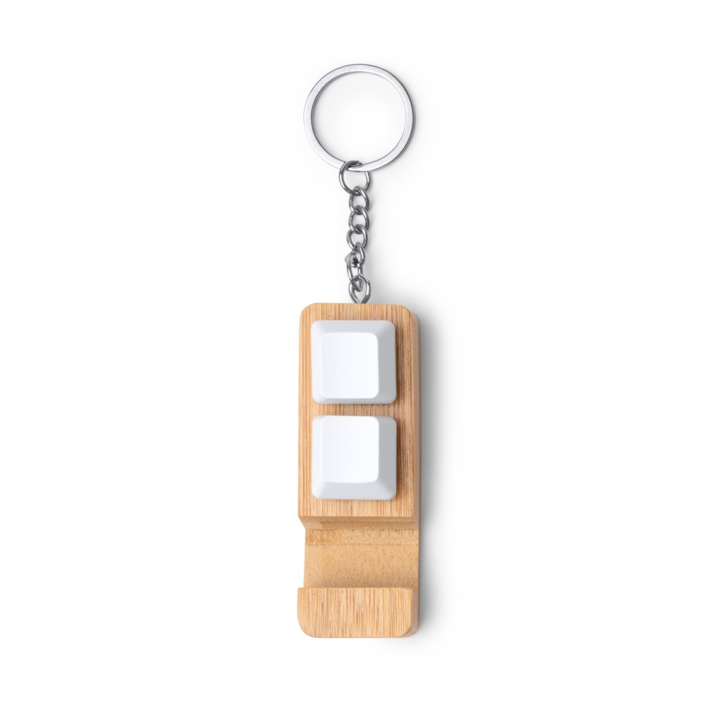 Brelok z bambusa z uchwytem na smartfon i funkcją antystresową — posiada białe klawisze przypominające klawiaturę, które można naciskać i wykorzystywać jako element redukujący stres.
