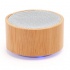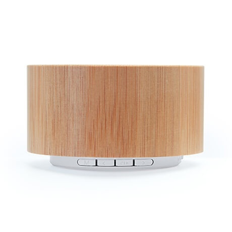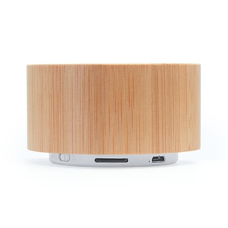Okrągły głośnik bezprzewodowy w obudowie z naturalnego bambusa i białego ABS. Przyciski i siateczka w kolorze białym. Funkcje: radio FM, zestaw głośnomówiący, gniazdo kart Mini SD i moc głośnika 3W. Bateria do ponownego naładowania. Dołączony kabel. Podstawa antypoślizgowa. Produkt zapakowany w papierowe pudełko typu kraft.