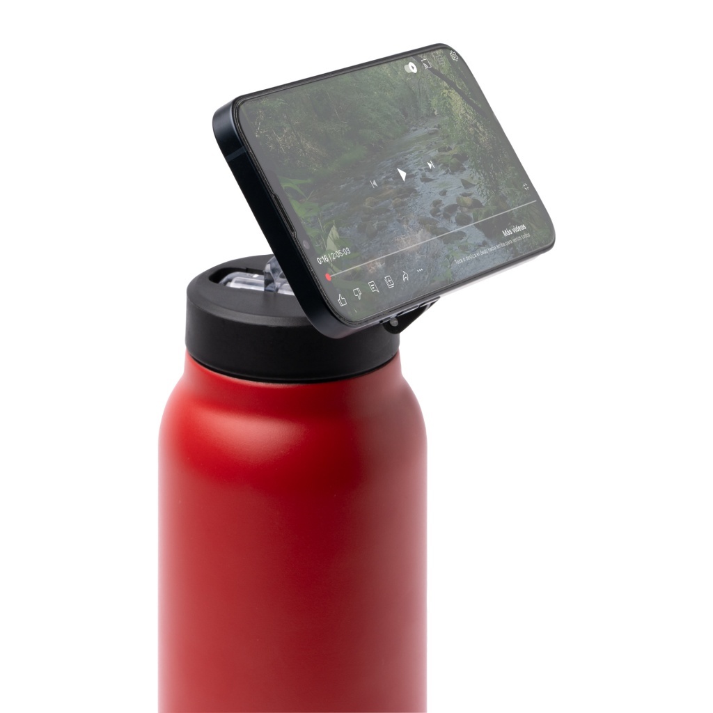 Termiczna butelka z podwójnymi ściankami, wykonana z recyklingowanej stali nierdzewnej 304. Wyposażona w pokrywkę z magnetycznym pierścieniem do mocowania telefonu, składana słomka oraz antypoślizgową gumę w podstawie.