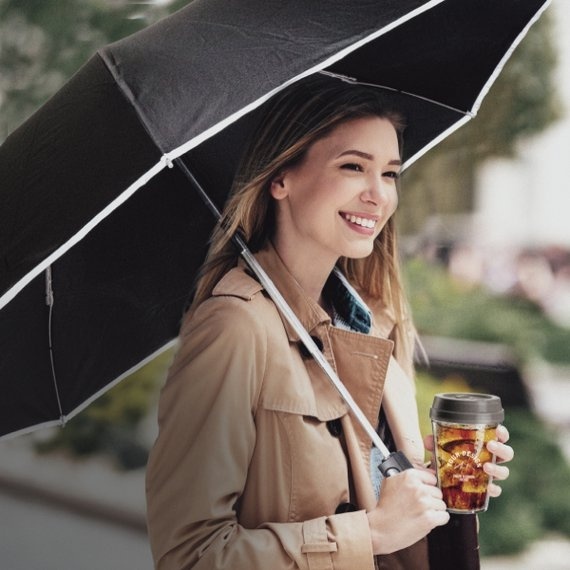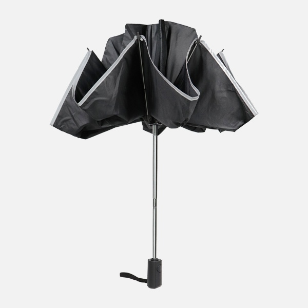Odwracalny parasol RPET 23″ Huomio. Uszyty z ekologicznej tkaniny RPET pongee. Baldachim wyposażony w odblask 3M dla większego bezpieczeństwa w ruchu. Aluminiowy korpus z rączką wykończoną PU. Do zestawu dołączony czarny pokrowiec ochronny.
