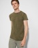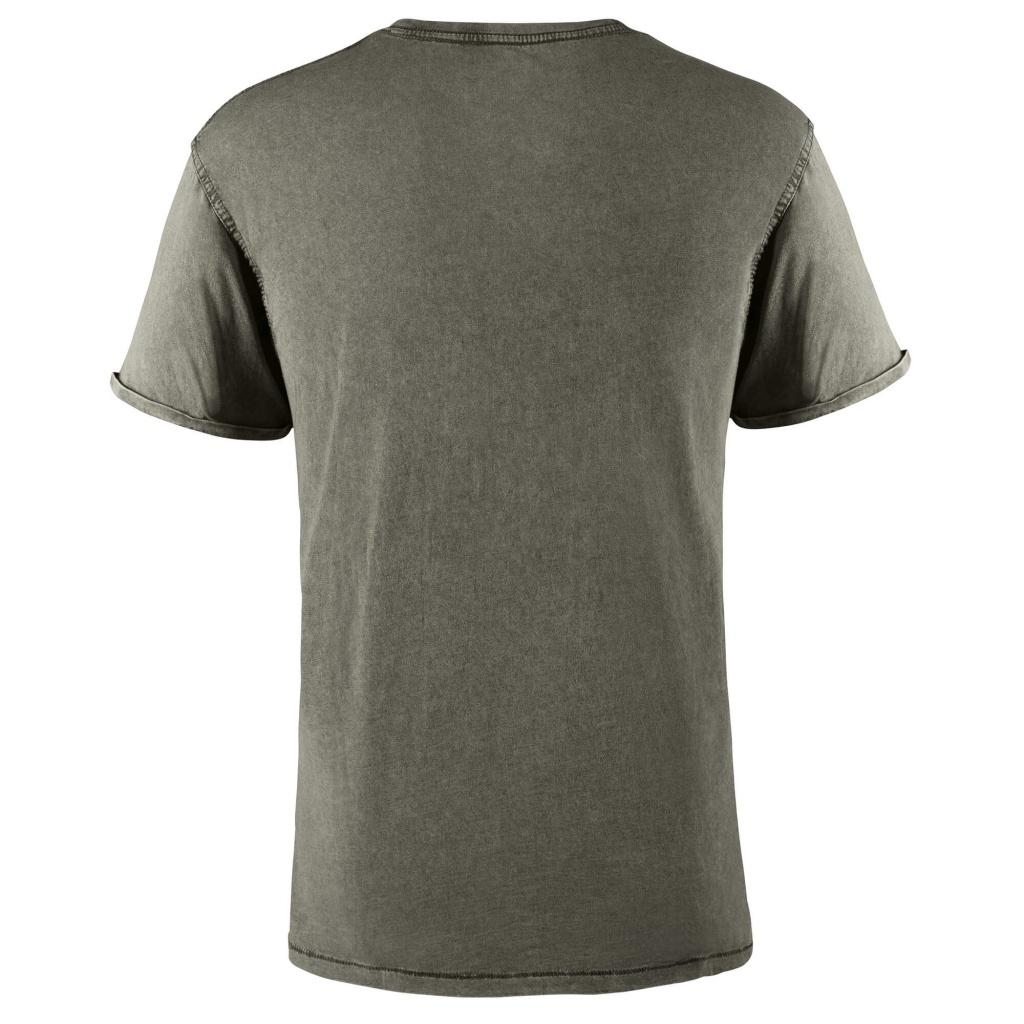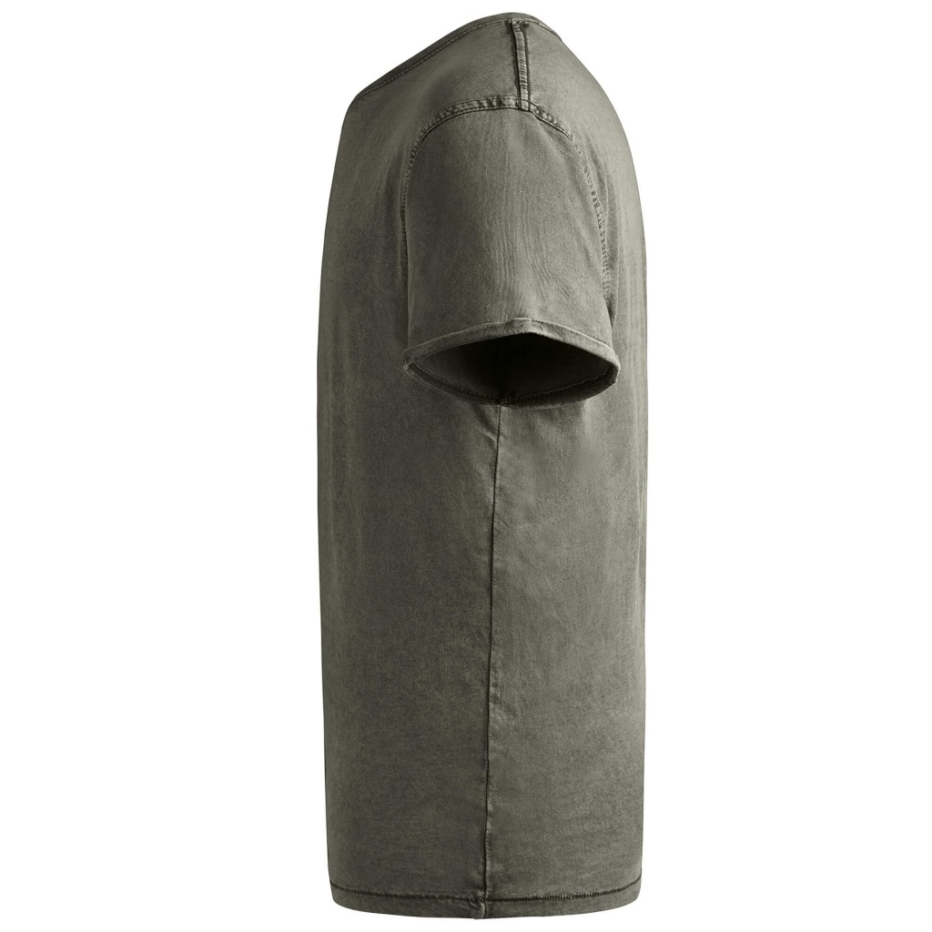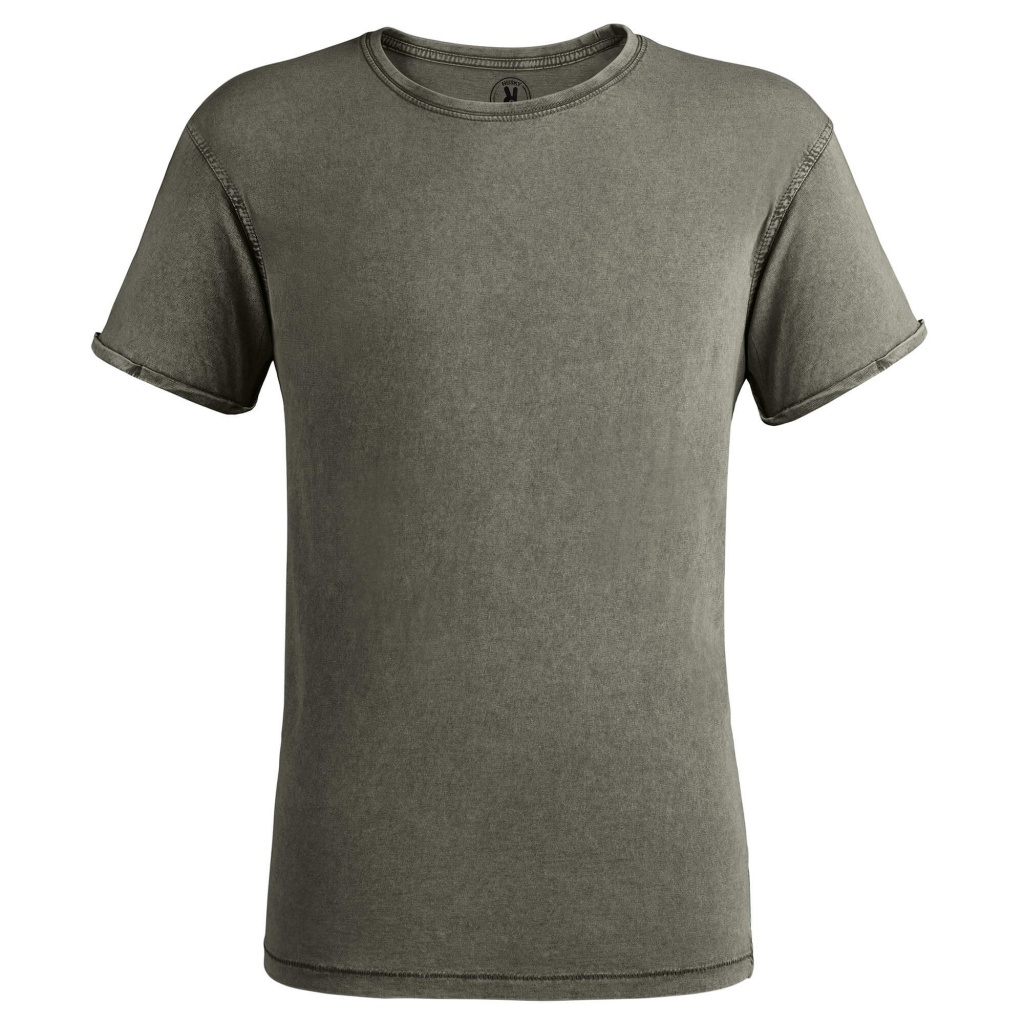 T-shirt z krótkim rękawem o dżinsowym wykończeniu. Okrągły, prążkowany dekolt, wzmocniony szew na ramieniu, podwójne szwy w pachach oraz wywijane mankiety.