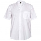 Męska koszula z krótkim rękawem uszyta z popeliny. Posiada klasyczny, krochmalony kołnierzyk z guziczkiem oraz kieszeń na lewej piersi. Zapięcie na siedem guzików w kolorze tkaniny. Wyprofilowany dolny brzeg zapewnia estetyczny wygląd i komfort noszenia. Prosta w użytkowaniu i pielęgnacji.