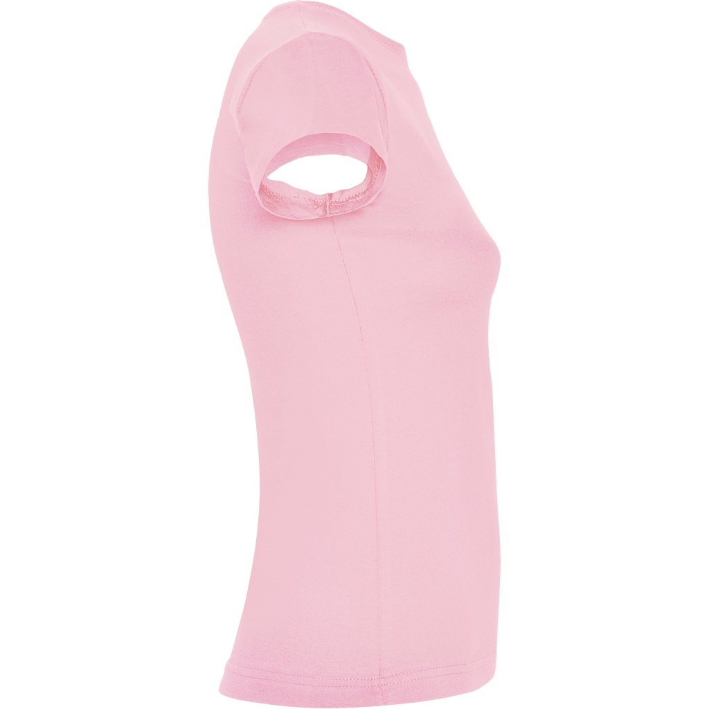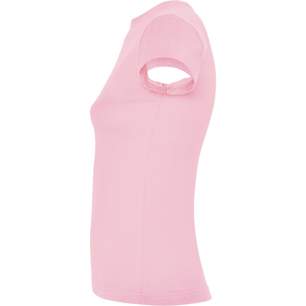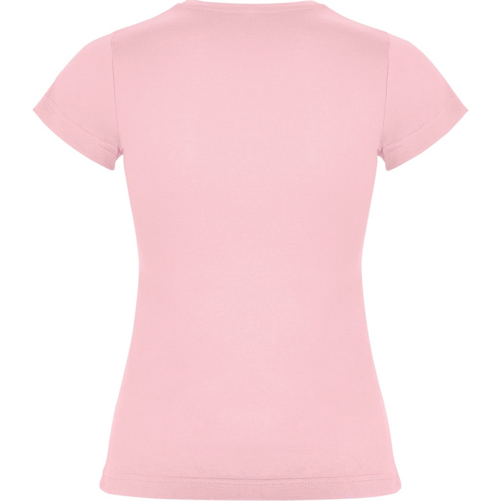 Dopasowana koszulka damska. Zaokrąglony, dwuwarstwowy ściągacz przy szyi, typowo damski fason. Wzmocnione, kryte szwy przy kołnierzyku i na ramionach, szwy boczne.
