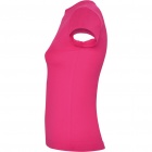 Dopasowana koszulka damska. Zaokrąglony, dwuwarstwowy ściągacz przy szyi, typowo damski fason. Wzmocnione, kryte szwy przy kołnierzyku i na ramionach, szwy boczne.