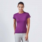 Dopasowana koszulka damska. Zaokrąglony, dwuwarstwowy ściągacz przy szyi, typowo damski fason. Wzmocnione, kryte szwy przy kołnierzyku i na ramionach, szwy boczne.