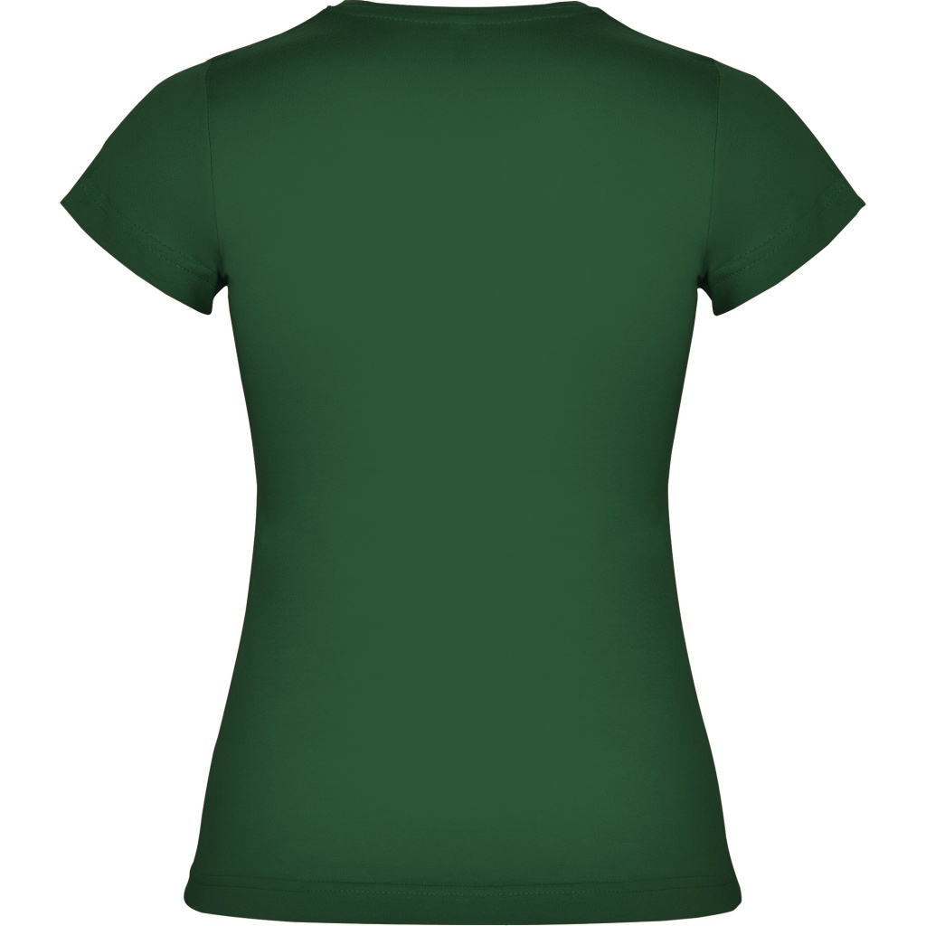 Dopasowana koszulka damska. Zaokrąglony, dwuwarstwowy ściągacz przy szyi, typowo damski fason. Wzmocnione, kryte szwy przy kołnierzyku i na ramionach, szwy boczne.