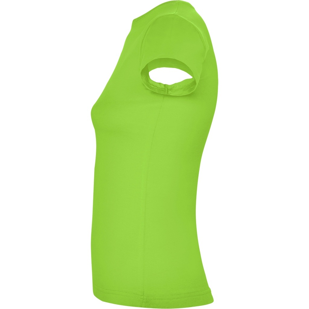 Dopasowana koszulka damska. Zaokrąglony, dwuwarstwowy ściągacz przy szyi, typowo damski fason. Wzmocnione, kryte szwy przy kołnierzyku i na ramionach, szwy boczne.
