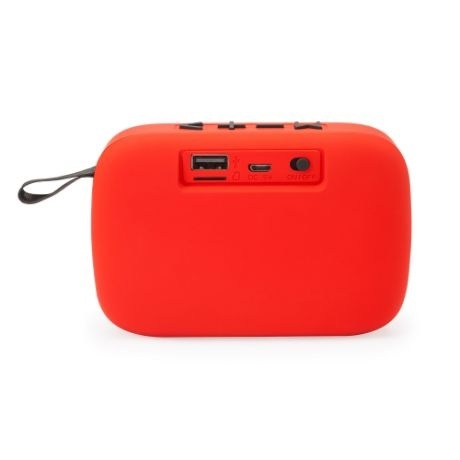 Przenośny, bezprzewodowy głośnik Bluetooth. Obudowa pokryta matową gumą, wyposażona w praktyczny uchwyt do wygodnego przenoszenia.
